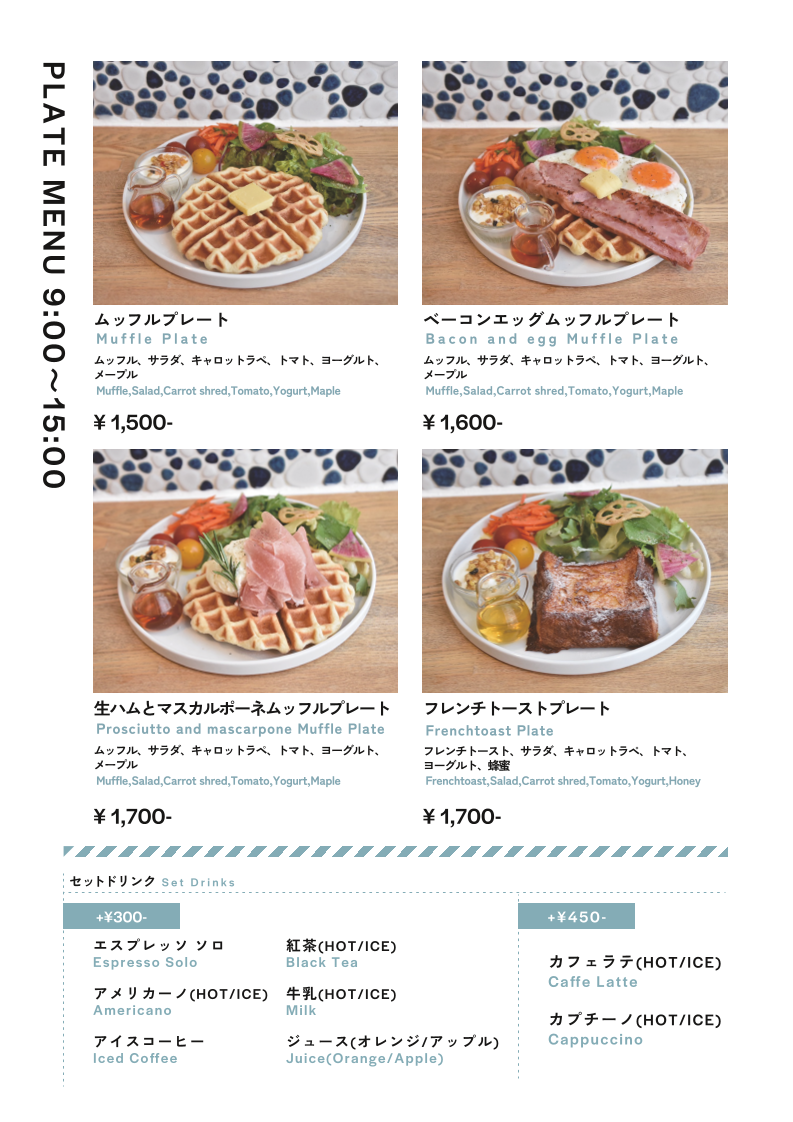 Bread, Espresso & Jiyugata in Tokyo's Jiyugaoka neighborhood offers a delightful and varied menu that caters to different tastes throughout the day. The restaurant’s Plate Menu (available from 9:00 AM to 3:00 PM) provides an assortment of hearty and satisfying options. The Muffle Plate serves as a base with its delicious muffle, while the Bacon and Egg Muffle Plate adds a savory twist for those looking for a protein-packed start to their day. If you prefer something a bit more refined, the Prosciutto and Mascarpone Muffle Plate offers a delicate combination of salty prosciutto and creamy mascarpone, creating a luxurious breakfast experience. For those craving a sweeter breakfast, the French Toast Plate is a classic choice, with perfectly toasted bread, fluffy and golden, sure to please anyone with a penchant for indulgence.