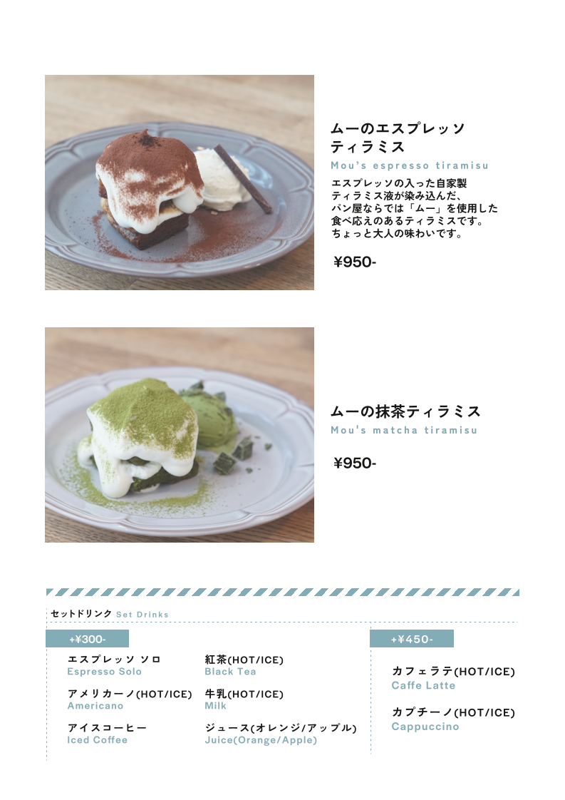 In the afternoon, from 1:00 PM, the Dessert Menu shines with its signature treats. The Moo French Toast delivers a decadent dessert version of the classic, loaded with flavors that make it a perfect treat for those with a sweet tooth. For coffee lovers, the Moo's Espresso Tiramisu is an absolute must-try, blending the rich bitterness of espresso with the creamy texture of traditional tiramisu. Meanwhile, the Moo's Matcha Tiramisu caters to fans of Japanese flavors, infusing the beloved matcha with the creamy dessert for a refreshing twist.